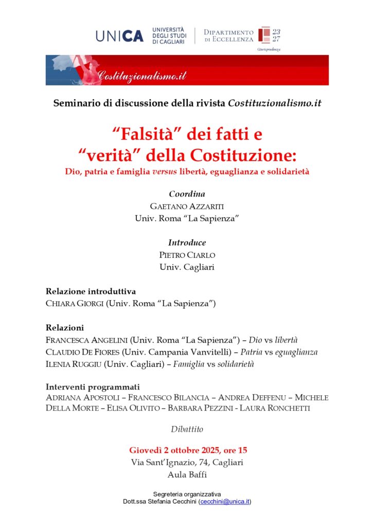 Seminario di discussione della rivista Costituzionalismo.it – Università degli Studi di Cagliari – Giovedì 2 ottobre 2025